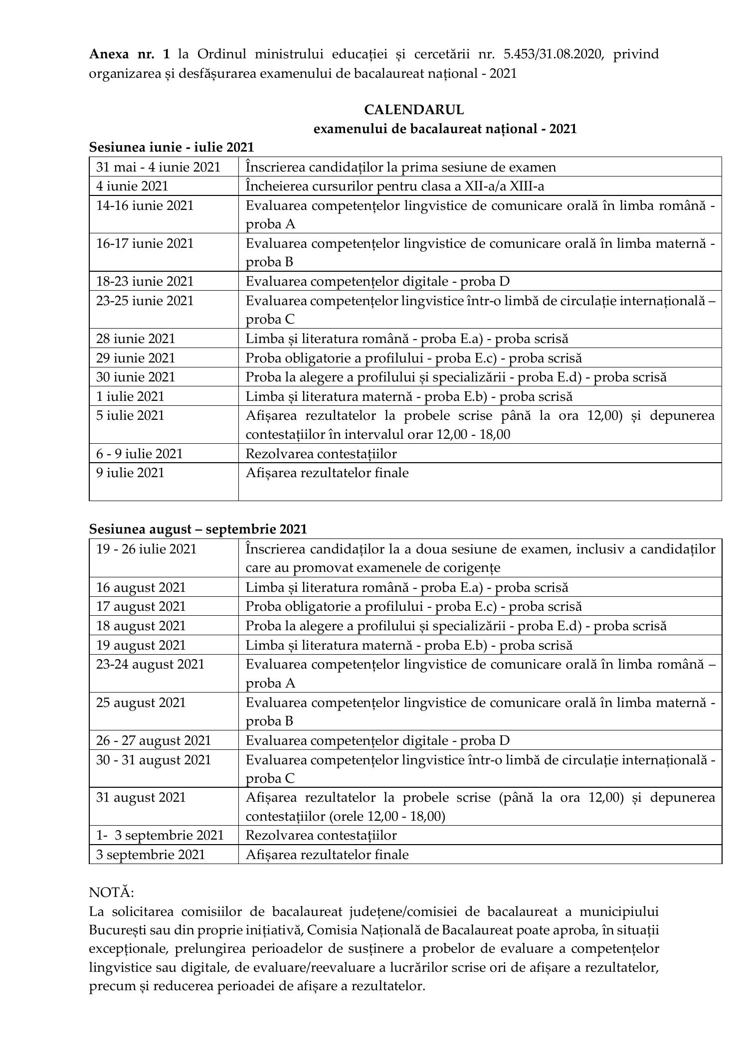 5453/2020 privind organizarea și desfășurarea examenlui național de bacalaureat 2021, se modifică și va avea următorul cuprins: